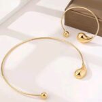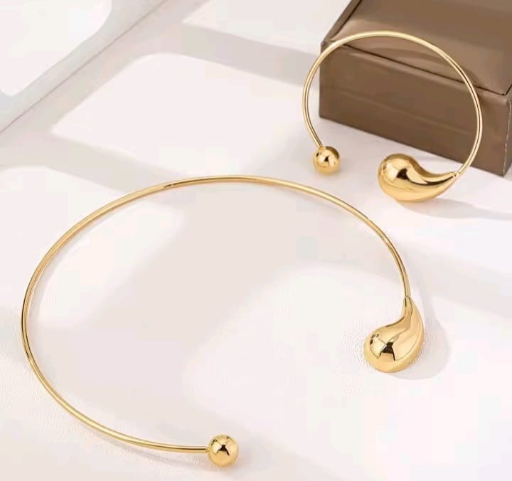 Coppia di bracciale e collana in acciaio color oro giallo ,filo sottile rigido alla schiava aperto con una sfera da un lato e una goccia dall’altro