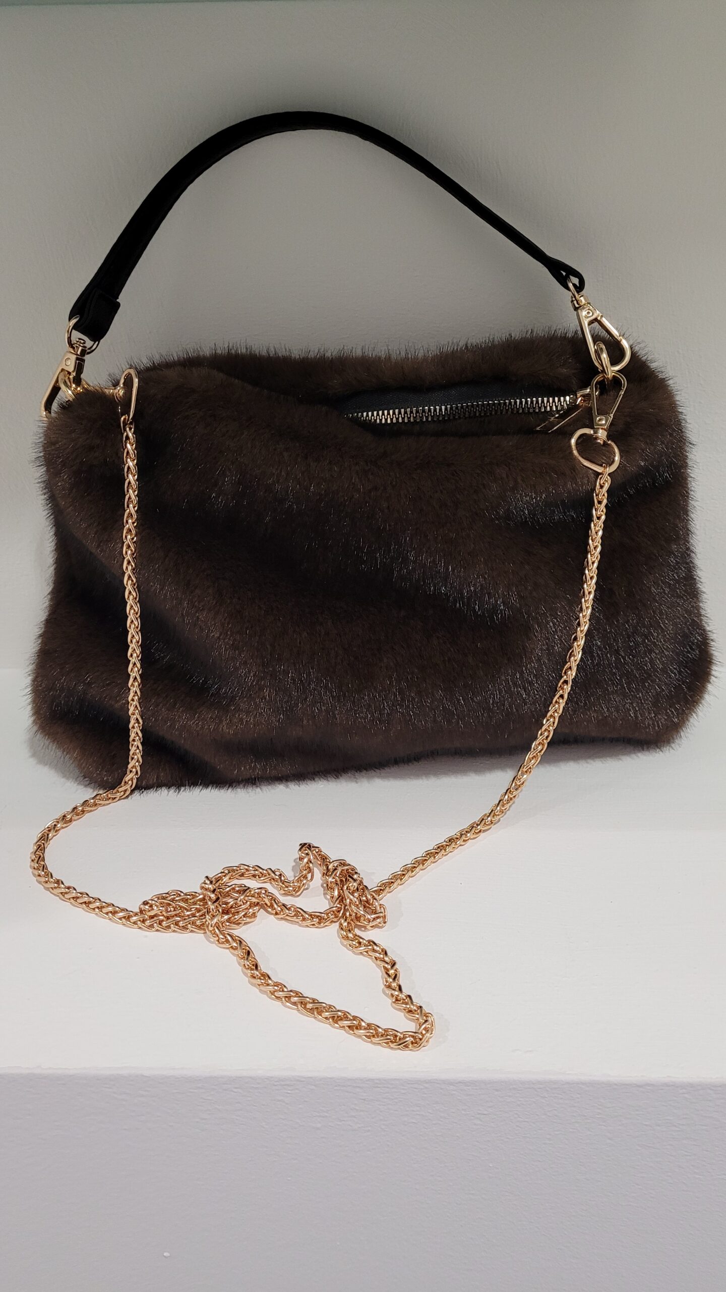 Borsa in pelliccia sintetica narrone scuro con dettagli in vera pelle nera e cerniera color oro